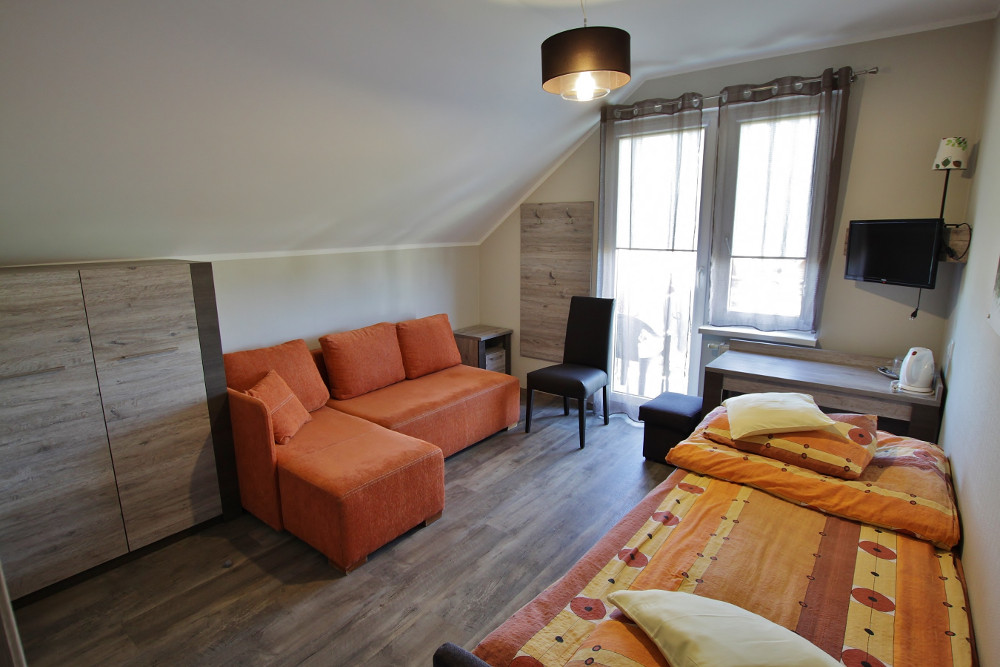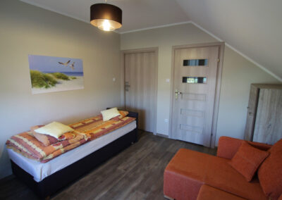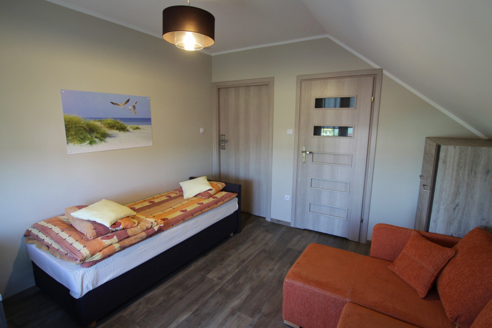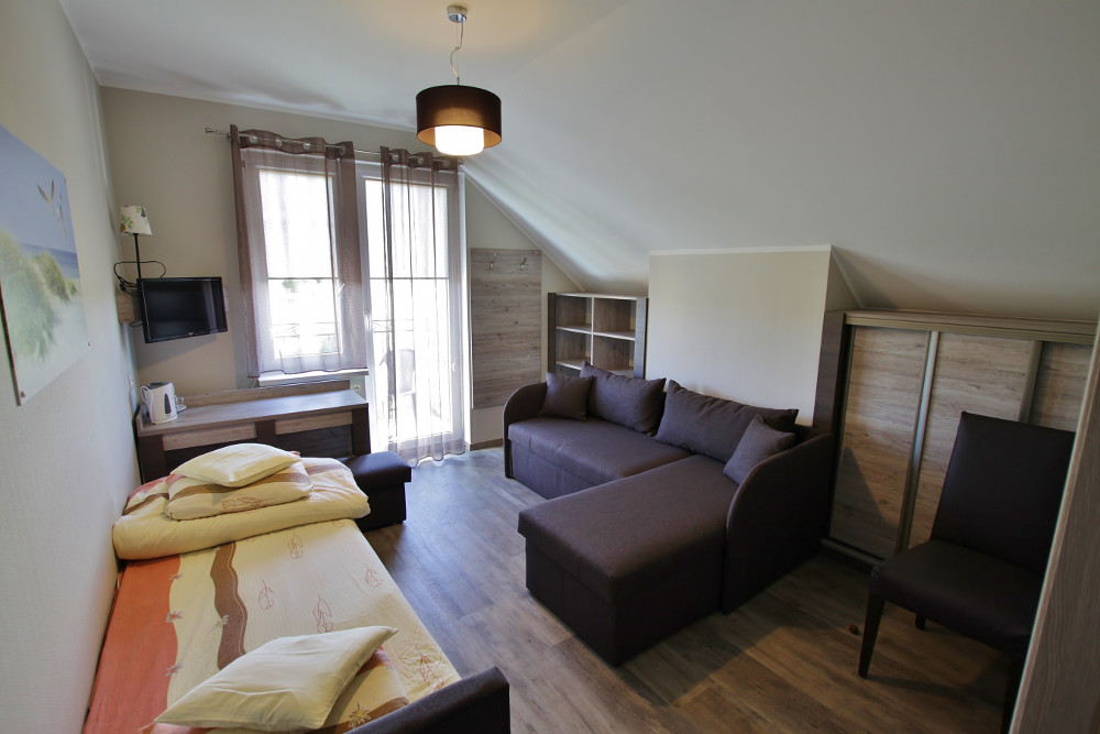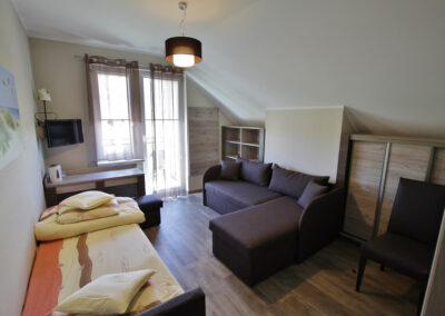 Funkcjonalne, zapewniające wygodę i spokój trzyosobowe pokoje z  prywatną łazienką.  Przeznaczone dla maksymalnie  3 osób. Wyposażone w narożnik oraz  tapczan. W łazience wc i kabina prysznicowa. W pokoju znajduje się pościel, czajnik oraz naczynia.